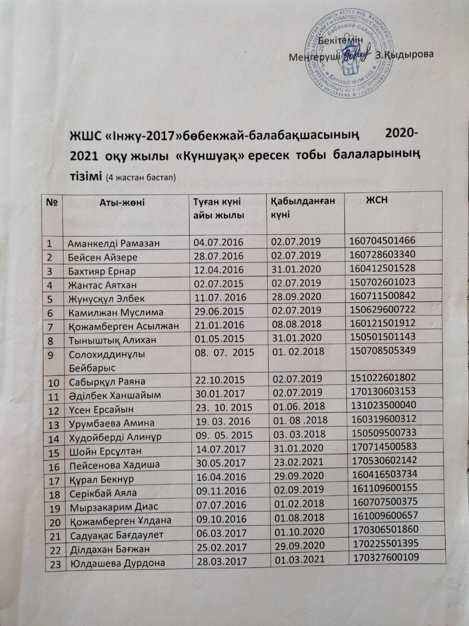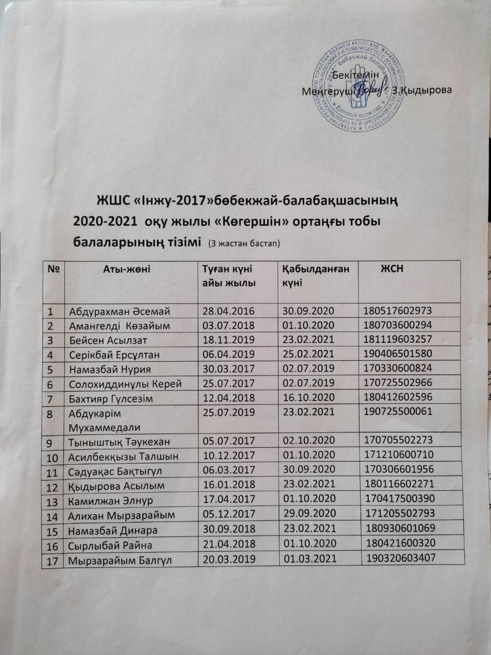 ЖШС «Інжу - 2017» бөбекжай - бақшасы
