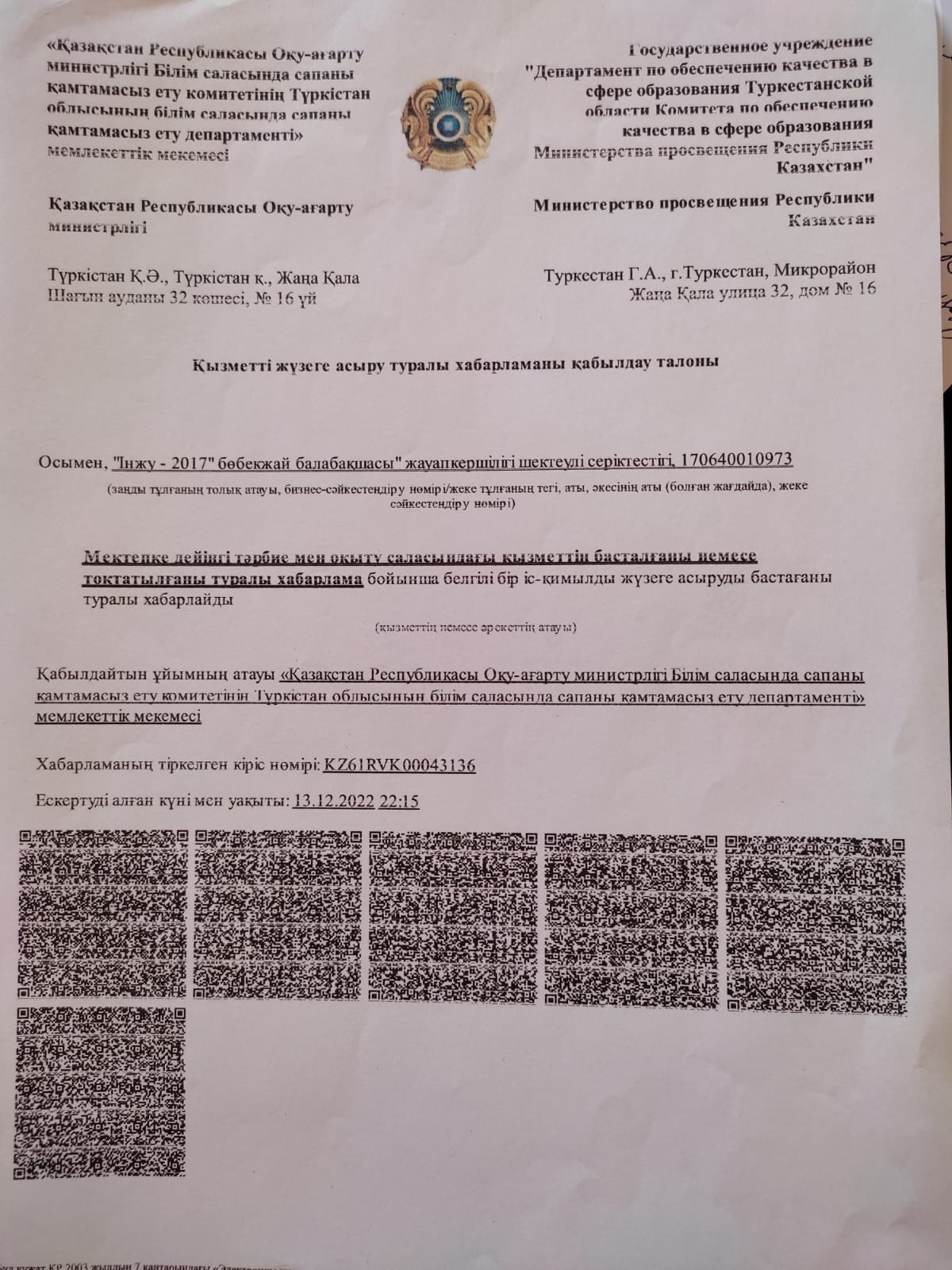 ЖШС «Інжу - 2017» бөбекжай - бақшасы
