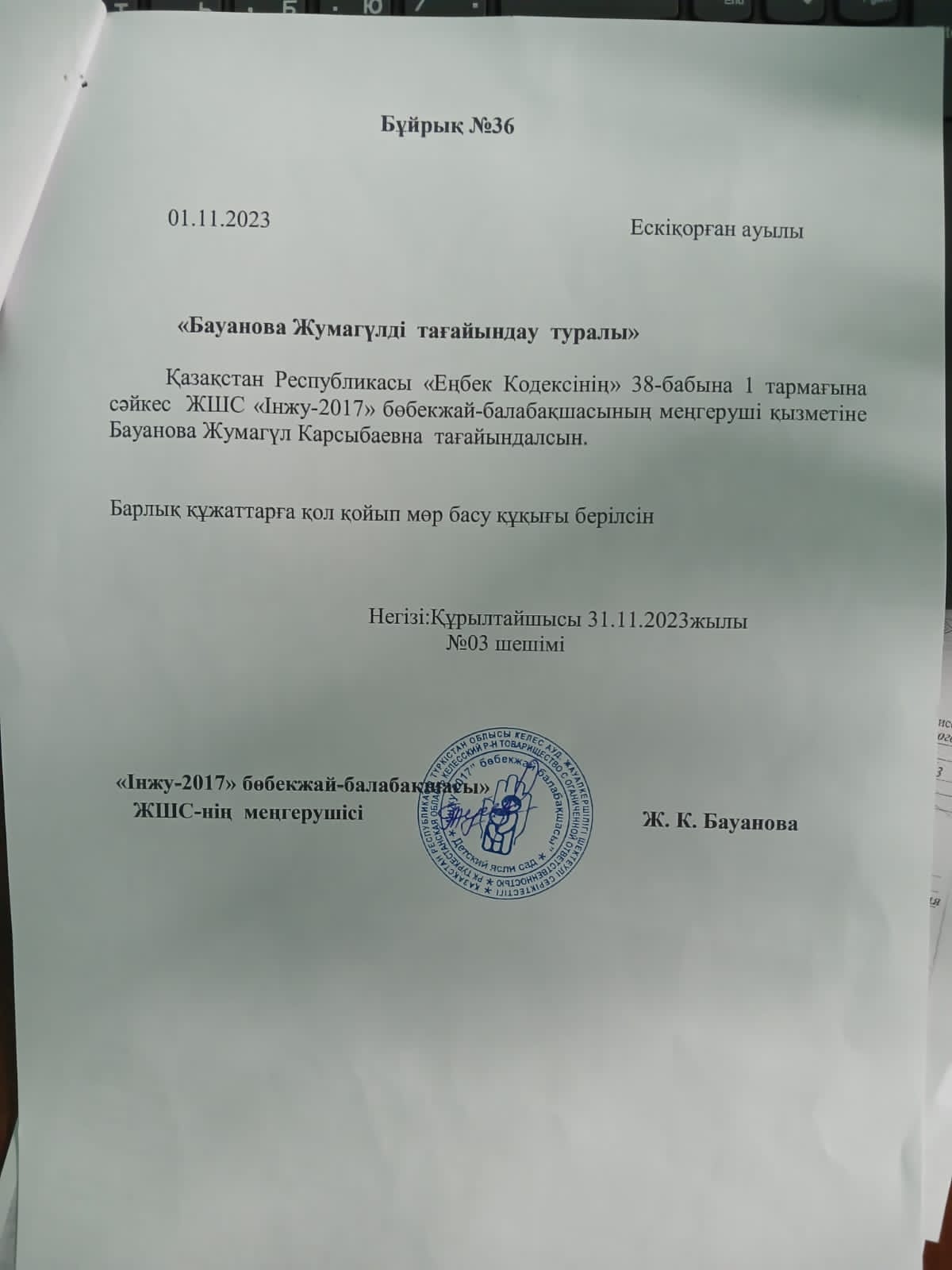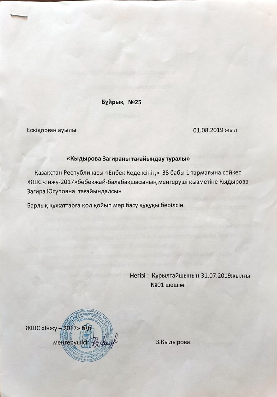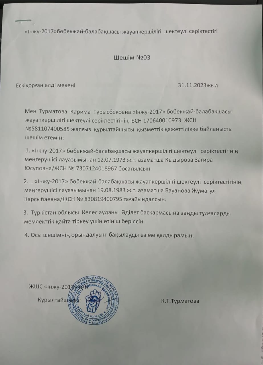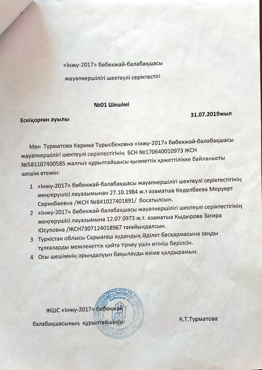 ЖШС «Інжу - 2017» бөбекжай - бақшасы
