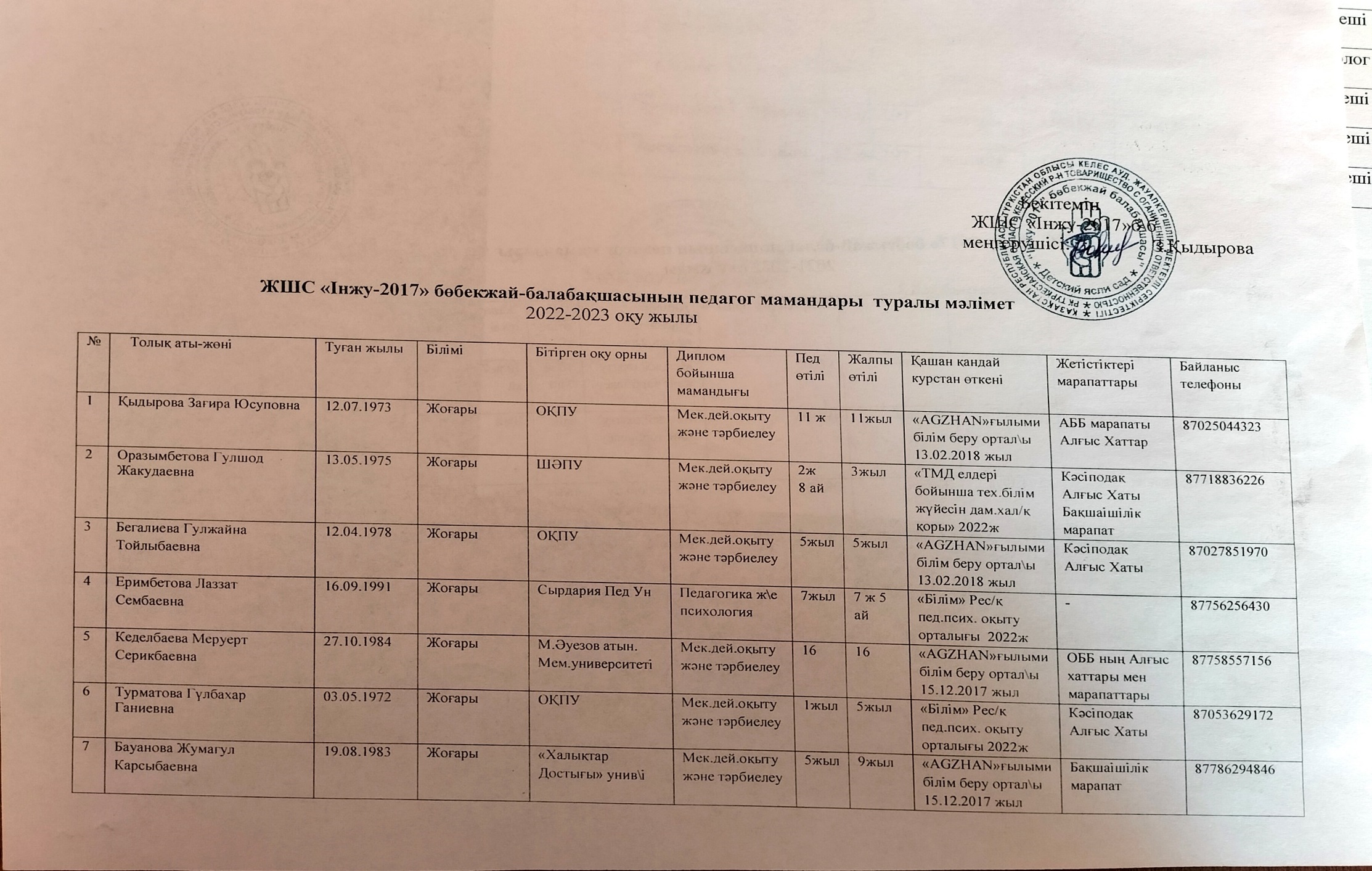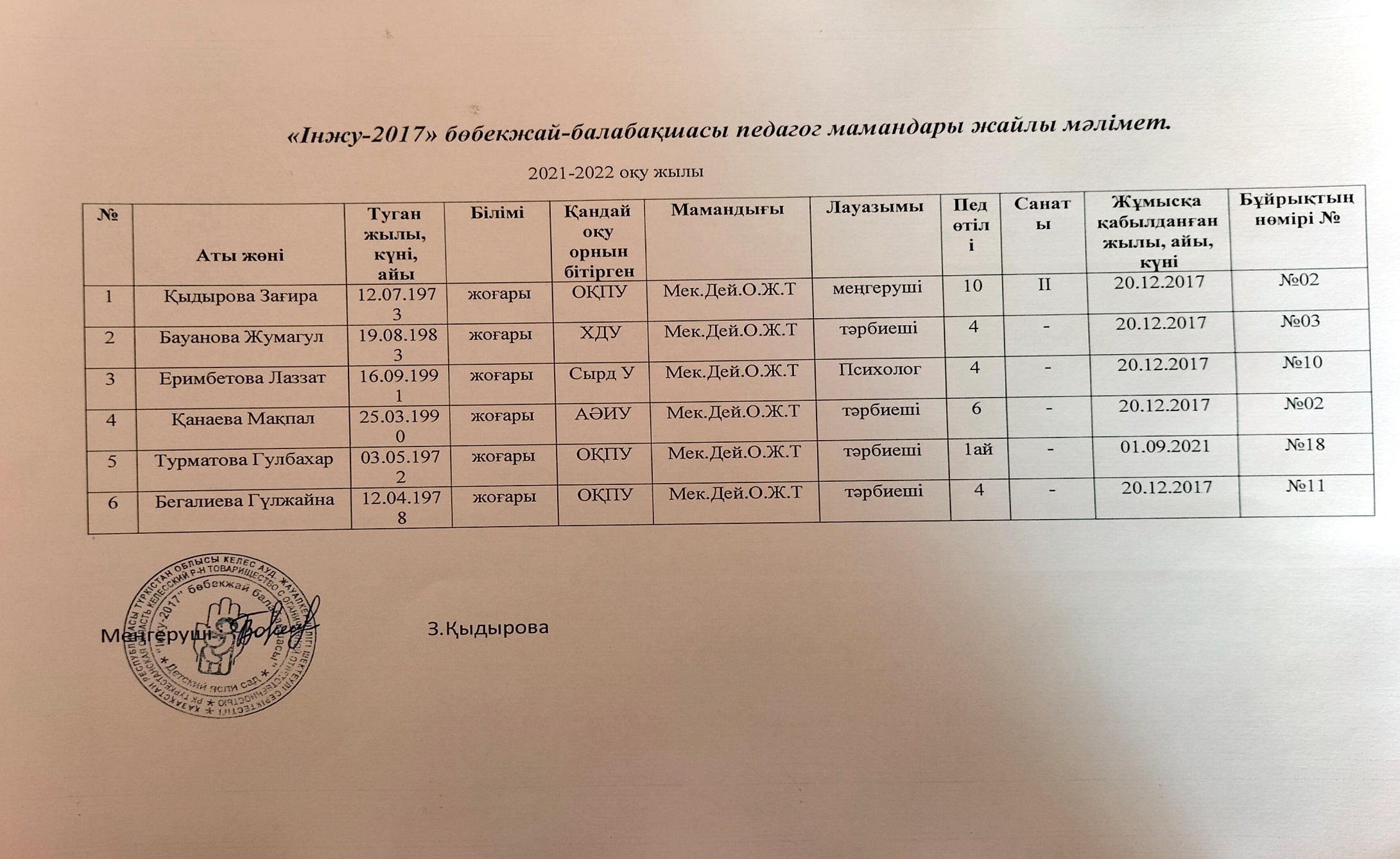 ЖШС «Інжу - 2017» бөбекжай - бақшасы